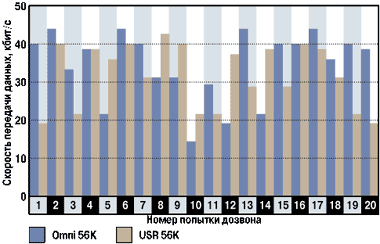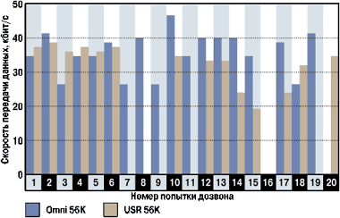 Конечно, здесь число звонков не столь велико, чтобы можно было делать какие-то выводы о сравнении качества линий этих двух ведущих провайдеров. И потому по нашей просьбе специалисты-тестировщики провели дополнительные испытания, набирая номера на линиях этих провайдеров (до 250). Однако они сделали вывод, что результаты носят случайный характер. Впрочем, им удалось установить, что линии передачи МГТС (Московская городская телефонная сеть) в данных направлениях по своим параметрам лучше, чем определено эксплуатационными нормами. Значит, в этом случае скорости передачи возрастают до максимально возможных для протокола V.34 — до 33 600 бит/c. А при установлении соединения лишь по цифровым каналам скорости передачи соответствуют протоколам V.90/V.92 и, следовательно, скорости приема достигают 44 000 бит/c. В результате они сделали вывод, что оба модема по этим показателям практически идентичны.