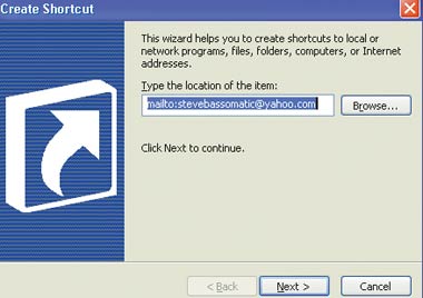 Способ преодоления. Щелкните правой кнопкой мыши на Рабочем столе и выберите «Создатьб?Ярлык». В командной строке (Windows 98/Me) или в поле «Укажите размещение обюекта» (Windows 2000 и XP), введите последовательность mailto:электронный адрес вашего постоянного адресата(рис. 2). Щелкните на кнопке «Далее», дайте ярлыку имя и поместите его на панель быстрого запуска. Всякий раз, когда вы будете щелкать на нем, программа электронной почты раскроет новое послание с адресом вашего постоянного корреспондента в поле «Кому:».