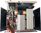 Под защитной крышкой БП наряду с двумя основными алюминиевыми радиаторами имеются дополнительные теплоотводящие гребенки. Вызывает некоторое опасение то, что выходные кабели проходят между зубьями мини-теплоотводов и поэтому могут легко оплавиться.