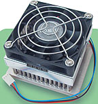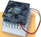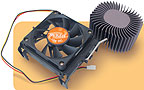 Качество исполнения не порадовало: маленький алюминиевый радиатор с плохо обработанным основанием, к которому привинчен небольшой вентилятор на подшипнике скольжения. Кстати, хотя его размеры и вызывают некоторые сомнения, тем не менее он работает на больших оборотах с малым уровнем шума.