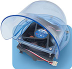 Устройство представляет собой неразъемную конструкцию, состоящую из медного радиатора, достаточно мощного (но тихого) вентилятора, а также прозрачной пластиковой трубы, которая обеспечивает выдувание горячего воздуха за пределы корпуса и втягивание холодного для обдува процессора через отверстие под блоком питания (пожалуй, не хватает только нескольких светодиодов для подсветки этой оригинальной конструкции). Радиатор состоит из овального полированного основания (полировка позволяет добиться большего коэффициента передачи тепла от процессора), от которого во все стороны отходят тонкие медные ребра. Отличительные особенности этого устройства — простота и удобство крепления и практически бесшумная работа вентилятора.