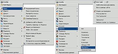 Панель YandexBar имеет три режима: «Стандартный», «Мастер» и «Каталог». В «Стандартном» на панели отображается минимум кнопок — поля ввода, выбора поисковой системы и кнопка «Службы». В режиме «Мастер» к ним добавляются кнопки отчета по просматриваемому сайту, а в режиме «Каталог» кнопка «Службы» заменяется ниспадающими меню, соответствующими разделам каталога Яndex (см. рис. 1).