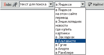 Панель YandexBar предназначена, как и сама система Яndex, для поиска в Сети. На ней расположено поле, введя в которое искомое слово (или фразу) и нажав всего одну кнопку, можно перейти на страницу поисковой системы, где это слово и будет найдено. Замечательно то, что поисковую систему можно выбирать: есть как российские системы «Апорт», «Рамблер», Яndex, так и зарубежные AltaVista и Google (рис.2).