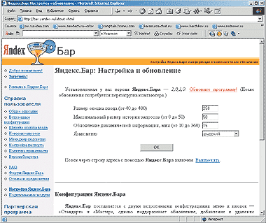Крупнейшая в русскоязычной части Интернета система поиска Яndex (http://www.yandex.ru) предлагает всем желающим добавить в IE панель инструментов YandexBar (рис. 1).