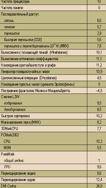 За исключением некоторых результатов, выбивающихся из общего ряда, можно сказать, что для приложений, чувствительных к мощности процессорного ядра, разница производительности находится в точном соответствии с тактовой частотой. Для тех же случаев, когда существенную роль играет оперативная память, различие заметно меньше — вплоть до полного совпадения результатов. То есть все происходит в строгом соответствии с теорией: отношение производительностей систем на одном и том же процессоре, работающем на различных тактовых частотах, отстает от отношения тактовых частот.