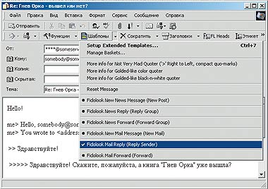 Цитаты подсвечиваются в окне создания сообщения Microsoft Outlook Express независимо от того, в каком формате письмо — текстовом или HTML. Однако если вы составляете письмо в HTML-формате, то все цветовые выделения сохранятся, и получатель увидит письмо в том же виде, что и вы, — с подсвеченными цитатами, независимо от того, установлен ли у него Fidolook.