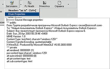 Так какие же функции предоставляет Fidolook? Прежде всего небольшие улучшения интерфейса Microsoft Outlook Express. В частности, для того чтобы увидеть заголовок письма в окне просмотра сообщения, достаточно нажать кнопку «Заголовки» (рис. 3). А если желательно видеть еще и тексты на полях «От:» и «Тема:», написанные кириллицей (при пересылке они кодируются в quoted-printable или в иную кодовую систему), то другой пункт меню кнопки «Заголовки» позволит сделать и это (рис. 3, справа).