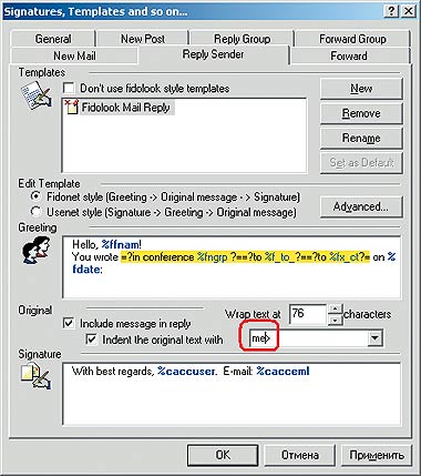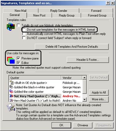Обратите внимание. Чтобы система шаблонов и цитирования работала и для писем в HTML-формате и чтобы их также можно было предварять специальными символами и раскрашивать в разные цвета, на закладке General диалогового окна Setup Extended Templates (рис. 6) уберите отметку напротив пункта Do not use templates for the messages in HTML format (обведен сверху на рис. 6). Кстати, здесь же допускается временно запретить Fidolook использовать шаблоны, не отказываясь от других ее функций.