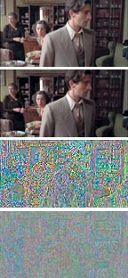 | Искажения, возникающие при сжатии изображения: а —исходный вариант; б — изображение, сжатое со скоростью потока 400 кбит/с; в — искажения изображения, сжатого со скоростью потока 400 кбит/с; г — искажения изображения, сжатого со скоростью потока 1000 кбит/с |