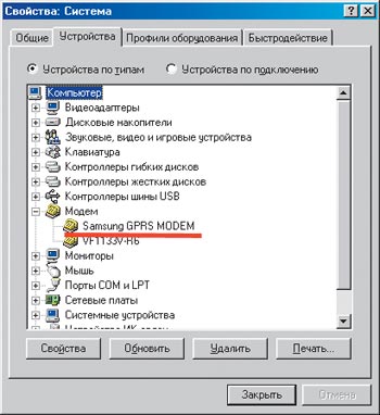 У разных аппаратов этот процесс происходит по-разному. Например, при первом подключении аппаратов Nokia операционная система сама распознает телефон как модем и назначает ему необходимые драйверы. В случае с аппаратами Samsung (напомню, все эксперименты мы проводим на трубке Samsung С-100) «мобильный» модем появляется в системе только после установки специальной программы EasyGPRS, о которой мы уже говорили ранее. В нашем случае модем называется Samsung GPRS MODEM (рис. 1).