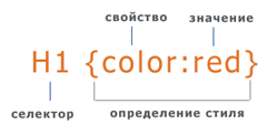 - селектор (H1) определяет тег в HTML-документе (заголовок, параграф и т.д.);