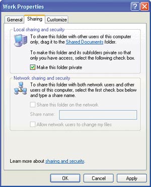 23Нулевой профиль. Каждый администратор может увидеть файлы на Рабочем столе, в папке «Мои документы» и в любом другом месте папки вашего профиля, отыскав в папке Documents and Settings подпапку, соответствующую вашей учетной записи. Для дополнительной защиты своих личных данных на диске формата NTFS откройте Documents and Settings, щелкните правой кнопкой мыши на той папке, которую вы собираетесь сделать недоступной, и выберите «Свойства». Затем на закладке «Доступ» включите функцию «Отменить общий доступ к этой папке» и щелкните на OK.