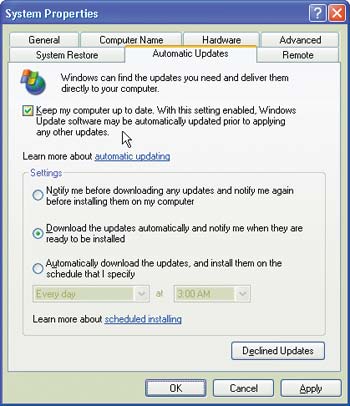 49Автоматизируйте обновление Windows. Чтобы автоматизировать выполнение функции обновления Windows XP (Windows Update), щелкните правой кнопкой мыши на значке «Мой компьютер», выберите «Свойства» и щелкните на закладке «Автоматическое обновление». В Windows Me и 2000 (Service Pack 3 или более поздний выпуск) откройте Панель управления и дважды щелкните на значке «Автоматическое обновление». В Windows 2000 и XP включите опцию «Выполнять обновление системы» и в любой из трех версий укажите один из трех доступных вариантов обновления (рис. 8).