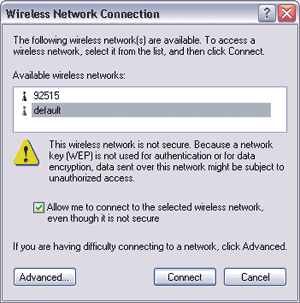 35Подключение к небезопасной беспроводной сети. Если кнопка «Подключить» в диалоговом окне «Беспроводное сетевое соединение» не задействована (при этом на экране она затенена серым), в сети могут отсутствовать средства обеспечения безопасности — службы Wired Equivalent Privacy или более новая Wi-Fi Protected Access. Чтобы обойти проблему, включите опцию Allow me to connect to the selected wireless network, even though it is not secure («Разрешить подключение к указанной беспроводной сети, даже если она небезопасна»). Однако имейте в виду, что вы рискуете при этом неприкосновенностью своих личных данных.