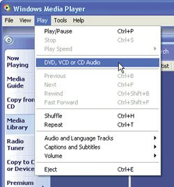 61Подключаем органы управления. Если вы открываете диск DVD или CD в проигрывателе Windows Media 9, а органы управления не работают, то выясните, видна ли панель меню проигрывателя (чтобы вывести ее на экран, вам, вероятно, понадобится в полном режиме щелкнуть на кнопке в левом верхнем углу окна проигрывателя). Выберите «Воспроизведение?Диск DVD или компакт-диск», причем учтите, что названия могут различаться (рис. 10).