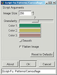 Представьте, будто вам не нравится, что степень сглаживания пятен невозможно задать в окне настройки генератора. Решить эту проблему можно двумя путями: применить сглаживание к каждому слою с пятнами вручную либо открыть файл script_fu_camo_pattern в папке GimpShare Gimp1.2scripts и заменить в нем фильтр сглаживания на другой. Как и в случае с предыдущим генератором, форма пятен текстуры изменяется от запуска к запуску программы.
