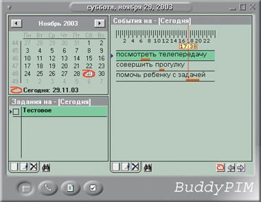 Еще одна симпатичная и очень красочная программа. По набору функций напоминает Reminder. Присутствуют «Список задач», «Адресная книга», «Будильник», «Заметки», «События». Вполне достаточный набор. Слева вверху всегда отображается календарь — слегка недоразвитый (нет быстрого перехода к нужной дате), но и на том спасибо, в Reminder?е и такого не было.