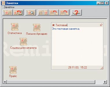 Что касается «Заметок», то они здесь очень похожи на модуль «Каталог» в программе Reminder. Суть — записная книжка с возможностью построения древовидной иерархической структуры записей. Каждая запись может быть приклеена на Рабочий стол поверх остальных окон и всегда оставаться на виду. Это очень похоже на принцип «горчичников». Изменять шрифт или цвета текста нельзя, да не очень-то и нужно. Зато есть вывод на печать — отдельной заметки или сразу целой группы.