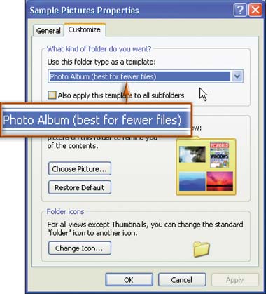 Порой задачи, перечисленные на этой панели, для какой-либо конкретной папки оказываются не слишком подходящими. Чтобы изменить список задач, щелкните правой кнопкой мыши на свободном поле окна папок и либо укажите опцию «Настройка вида папки», либо выберите ее из меню «Вид». (Данная команда неприменима к корневым каталогам дисков и к некоторым системным папкам.) На закладке «Настройка» из ниспадающего списка шаблонов в разделе «Выбор подходящего типа папки» выберите такой, который больше других соответствует содержимому вашей папки, например, для папки, содержащей небольшое количество файлов с изображениями, подойдет «Фотоальбом» (рис. 1). Щелкните на кнопке «Применить», и когда створка типичных задач отобразит нужные вам варианты, закончите настройку, нажав OK.