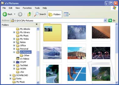 Уместите в папку побольше эскизов. Существует еще один способ разместить побольше эскизов на правой створке Проводника Windows XP. Сначала убедитесь, что панель папок видна, выбрав опции «Вид?Панели обозревателя?Папки». Теперь щелкните на любой папке, отличной от содержащей ваши эскизы. Затем, оставаясь на панели папок, щелкните при нажатой клавише на папке, включающей эскизы, чтобы снова открыть ее. Таким образом вы удалите имена файлов, отображаемые под эскизами, что позволит увидеть на правой створке несколько большее количество эскизов (рис. 2). Имена файлов восстановятся, если открыть какую-нибудь другую папку, а затем снова щелкнуть на папке с эскизами при нажатой клавише .