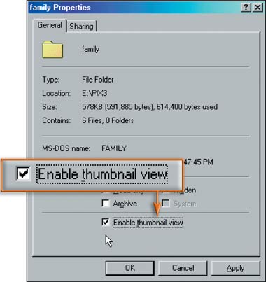 Задействуйте эскизы страниц. Все версии Windows, начиная с 98, отображают в виде эскизов страниц файлы распространенных графических форматов — .bmp, .gif, .jpg и (в поздних версиях Windows) .tif. Задайте «Вид?Эскизы страниц» на панели Главного меню папки или из меню, вызываемого правой кнопкой мыши. В Windows 98 эту опцию вы так просто не увидите, однако если нажать клавишу и подняться на уровень выше, то, щелкнув правой кнопкой мыши на той папке, где находятся изображения, можно выбрать опцию «Свойства» и на закладке «Общие» в диалоговом окне свойств папки включить функцию «Использовать просмотр эскизов», после чего щелкнуть на OK. При следующем открытии соответствующей папки в меню «Вид» должна появиться опция «Эскизы страниц».