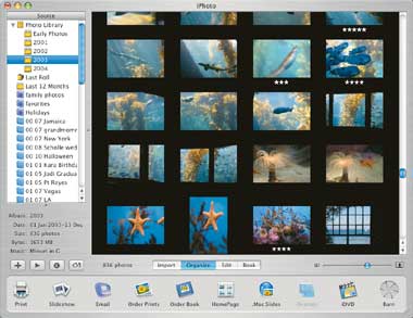 Менеджер цифровых фотографий iPhoto?04, работает заметно быстрее, чем его предыдущие версии (как и iMovie?04, он доступен лишь в составе пакета iLife?04; возможность бесплатной загрузки с сайта Apple не предоставляется). Причем программа обеспечивает не только более быстрые прокрутку, перетаскивание и изменение размеров изображений, но и продуманную их организацию, а также оперативный поиск.
