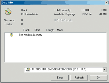 Указав в меню Recorder пункт Medium-info, можно посмотреть свойства вставленной болванки CD-R (или CD-RW). В данном случае это пустой (готовый к записи) перезаписываемый диск емкостью 703 Мбайт (рис. 14). Когда нужно стереть старую запись на перезаписываемом диске, вызовите команду Erase Rewritable.