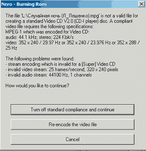 Если параметры файла не соответствуют стандарту Video-CD, то Nero предложит самостоятельно перекодировать его (рис. 13). Нажатие кнопки Re-encode запускает процесс конвертирования фильма в формат MPEG-1 с помощью встроенного в Nero кодировщика.