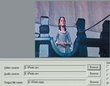 Рассмотрим пример. Если открыть в TMPGEnc файл фильма «Пираты Карибского моря», то в строке описания можно увидеть размер кадра 416х250 пикселов. При попытке TMPGEnc вписать картинку в формат 352х288 пикселов физиономии действующих лиц ненормально вытянутся (рис. 4). В этой ситуации можно либо разместить видеоряд в середине кадра, добавив сверху и снизу черные поля (рис. 5), либо отрезать слева и справа «лишние» кусочки так, чтобы оставшаяся часть картинки полностью заняла кадр с отношением сторон 3:4 (рис. 6).