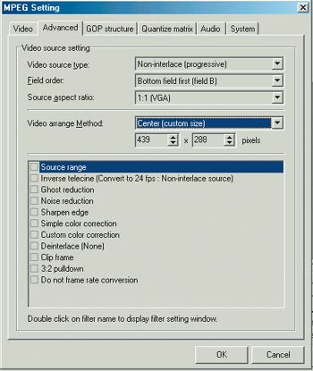 Любопытным рекомендую заглянуть на вкладку Advanced. Однако при создании Video-CD позиции, указанные на ней, скорее всего не понадобятся. Они нужны тем, кто захочет конвертировать фильм в формат MPEG-2. Здесь выбирается тип развертки — прогрессивный или чересстрочный (для Video-CD — понятие бессмысленное, так как этот формат работает только с первым полем1), порядок полей (тоже не нужно), аспект (т. е. отношение сторон: 3:4 или иное), метод изменения размеров изображения. Последние два пункта могут нам пригодиться, если исходный фильм имеет пропорции кадра, отличные от 3:4.