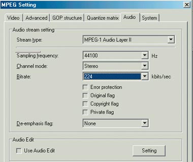 Теперь откройте вкладку Audio. В первом поле должно стоять Mpeg 1 Audio Layer II, под ним — 44 100 Hz, ниже Stereo, еще ниже 224 Kbit/sec. Поле Audio Edit предназначено для опытных пользователей и позволяет редактировать звук (рис. 8).