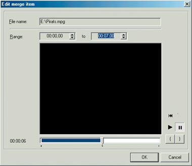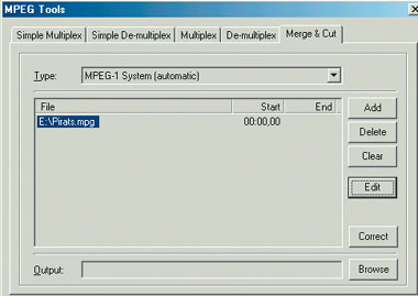 Теперь можно нажать Start, и программа начнет свою работу. По ее завершении образуется файл MPEG-1, соответствующий стандарту Video-CD. Если продолжительность фильма превышает 1 ч 10 мин, то на 700-Мбайт болванку он не уместится. В этом случае следует открыть окно MPEG Tools (рис. 9), перейти на вкладку Merge&Cut, выбрать мышью полученный файл фильма объемом от 700 до 1400 Мбайт и нажать кнопку Edit (рис. 10). В появившемся окне редактирования надо указать, где видеофайл будет разрезан на две части (например, в середине, рис. 11). Затем в строку File name необходимо вписать новое имя файла (скажем, Pirats1) и нажать Run (кнопка с треугольником). Далее потребуется обозначить второй фрагмент — в первое окошко поля Range ввести кадр из середины фильма, а в последнее — конечный кадр картины. Второй отрезок назовите Pirats2 и вновь щелкните на кнопке Run. Итак, мы получили два фрагмента длиной в полфильма, которые при общей продолжительности картины менее 2 ч 20 мин должны уместиться на две болванки CD-R.