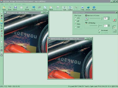 После знакомства с Photoshop дизайн этого оптимизатора кажется более чем скромным и даже несколько неудобным. Все основные действия выполняются с помощью небольших пиктограмм в левой стороне окна, назначение каждой из которых становится понятным только в результате нажатия. Поэтому, чтобы разобраться, как же преобразовать файл в один из поддерживаемых форматов, пришлось потратить некоторое время. Еще один недостаток интерфейса оптимизатора в том, что оригинальное и обработанное изображения, а также все настройки располагаются в разных окошках, которые так и норовят наехать одно на другое (рис. 2). Количество показываемых одновременно оптимизированных версий каждой картинки может варьировать в «широких» пределах от нуля до одного . Зато нет ограничений на число открытых файлов. Никаких излишеств в программе не предусмотрено. Впрочем, требовать их от ПО, занимающего чуть более мегабайта дискового пространства, немного некорректно. Приложение может сохранять файлы четырех типов: GIF, JPEG, PNG и TIFF.