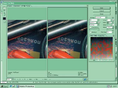Повод критиковать WebGraphics Optimizer и его создателей за небрежное отношение к делу дала мне право обработка нескольких изображений формата GIF. Бесспорно, управление сжатием реализовано очень удобно. Но вот размер получаемых файлов великоват. Легко сжимаемые изображения — графики, таблицы и схемы — были оптимизированы неплохо. Камнем преткновения стали фотографии. Качество преобразования в индексированную палитру просто отвратительное, а при попытке сгладить образовавшиеся грубейшие цветовые переходы различными методами размер файла становится неприемлемым. Здесь WebGraphics Optimizer показал наихудший результат среди всех тестируемых в этом обзоре оптимизаторов. В то же время с цветовой палитрой программа обращается очень корректно, а множество методов сглаживания позволяют перевести многоцветный рисунок в 8-битовую палитру достаточно качественно, но вот размер... Можно предположить, что основной упор сделан разработчиками именно на качество получаемых изображений, а не на компактность выходных файлов.