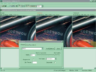 Видя столь широкую популярность (и высокую цену — 39 долл.) программы WebGraphics Optimizer, я ждал от нее хороших результатов сжатия. К сожалению, несмотря на многофункциональность, свою основную задачу — преобразование файлов из одного формата в другой — этот оптимизатор выполняет плохо.