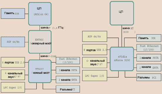 Блок-схема типичных решений на базе VIA и nForce для ЦП Athlon-64
