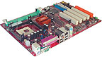 Комплектация явно не блещет. Когда читаешь документацию, прямо глаза разбегаются от перечисления всевозможных вариантов монтажных скоб с дополнительными разъемами, но на деле ни одна из них в комплект не входит. Кроме диска с драйверами и небольшим набором утилит (PC Alert, PC-cillin) в коробке оказалась только пара шлейфов — один для дисковода и один для жесткого диска. Шлейфы, правда, сложены в несколько раз вдоль и завернуты в оплетку, придающую им модное сейчас округлое сечение. Несмотря на полный формат ATX размеры платы несколько меньше стандартных, поэтому она вполне может быть установлена в некоторые компактные корпуса с недостаточной вентиляцией, так что такое оформление шлейфов надо признать разумным.