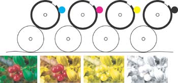 Пленки размещаются на этих пластинах и экспонируются, т. е. освещаются лампой с ультрафиолетовым излучением. Через темные участки лучи не проходят, а через светлые — проходят и разрушают располагающийся под ними полимер. Затем разрушенные участки полимерного слоя вымываются, и получается некоторое рельефное изображение, аналогичное тому, что было на пленке. Когда пластины для каждой из четырех цветовых (CMYK) составляющих исходного изображения подготовлены, то они устанавливаются в печатную машину на отдельные барабаны. Подаваемые туда соответствующие краски удерживаются лишь углублениями на полимерном слое пластин (откуда был вымыт разрушенный полимер) и через систему валиков переносятся с вращающихся барабанов на бумагу, где снова совмещаются в одно полноцветное изображение (рис. 4). Вы спросите: «А что же общего здесь с принтерами?!» Ответ дается в следующей части статьи. В ней пойдет речь о растрировании, GDI и PostScript, а также о некоторых проблемах, связанных с формированием цвета при печати на принтерах для дома и малого офиса.
