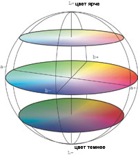 Восприятие цвета у всех людей несколько различается. Для того чтобы хоть как-то математически описать цвет, в 1931 г. Международной комиссией по освещению (CIE — Commission Internationale de L?Eclairage) была разработана система XYZ, охватывающая все цвета и оттенки, которые только может видеть человек. В дальнейшем, после усовершенствования XYZ, создается модель цветового пространства CIELab (рис. 1): по оси вверх — увеличение яркости цвета; от оси a к оси b по периметру окружности — изменение цветового тона, а по радиусу — изменение насыщенности цвета и на ее основе известные нам цветовые системы RGB и CMYK. В результате CIELab позволяет отдельно оперировать такими характеристиками, как цвет, цветовой тон, яркость, насыщенность. Надо понимать, что цветовая система описывает только некоторые цвета из общего цветового пространства. Например, изменить яркость в RGB невозможно! Вы, вероятно, возразите: мол, в Photoshop легко увеличить яркость изображения. Да, но не с помощью наращивания составляющих RGB, так как при этом изменяются исходные цвета пикселов, причем не равномерно, а путем математического пересчета цвета RGB в пространство Lab. Именно в нем и изменяется яркость цвета, а затем он конвертируется обратно в RGB.