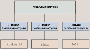 Загрузчик, прописанный в MBR, называется глобальным, а помещенный на какой-нибудь раздел жесткого диска — локальным. Так какой смысл устанавливать загрузчик в раздел жесткого диска, если BIOS передает управление главной загрузочной записи? Смысл в том, что тогда глобальный (основной) загрузчик загружает локальный, а последний — операционную систему.