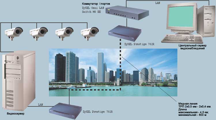 Схема построения системы видеонаблюдения на базе оборудовании ZyXEL с применением технологии SHDSL