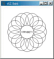 #!/usr/local/bin/yabasic -bg white -fg black clear screen a=200 r=25 rr=50 step_fi=pi/8 N=2*pi/step_fi open window a,a for i=0 to N x0=rr*sin(i*step_fi) y0=rr*cos(i*step_fi) circle a/2+x0,a/2+y0,r next i text a/2,a/2,"!ПРИВЕТ!","cc" inkey$ close window end