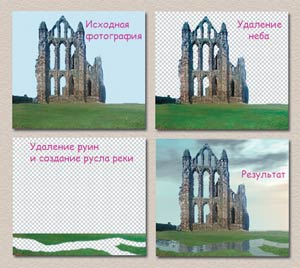 Откроем фотографию полуразрушенного аббатства и попробуем создать загадочную атмосферу. Если быть более точным, то мы добавим облака и реку, что позволит скрасить унылую картину.