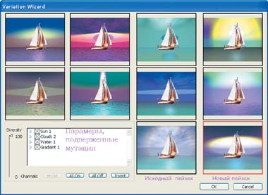 У фильтра есть «Волшебное хранилище», вход в которое осуществляется с помощью кнопки Presets в секции «Библиотека пейзажей» (рис. 2). Здесь вы найдете множество готовых шаблонов. Но еще более интересные возможности открывает щелчок кнопкой Variation Wizard («Генератор мутаций») все в той же библиотеке пейзажей. Это приведет нас в тайную лабораторию чародея (рис. 4). Так вот где создаются прекрасные пейзажи!
