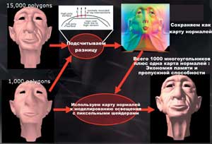 | Схематичный пример использования карт нормалей (маска разницы отклонений) |