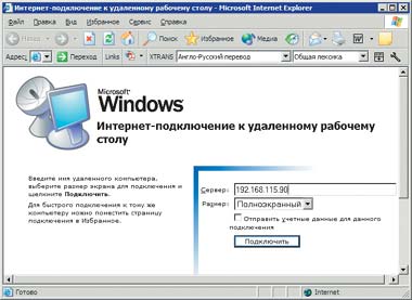 Примечание. Для работы с утилитой «Интернет-подключение к удаленному рабочему столу» необходима программа Internet Explorer версии 4.0 или более поздней. Сама программа «Интернет-подключение к удаленному рабочему столу» может быть установлена на одном из доступных в сети компьютеров, например на сервере, с которым обеспечена связь «удаленных рабочих столов». В нашем случае эта программа инсталлируется на тот компьютер, к которому мы хотим получить доступ.