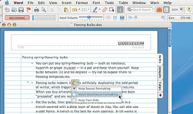 Кроме того, в новой версии Word предусмотрено создание звуковых заметок с помощью функции Audio Notes, доступной в режиме Notebook Layout. Для начала записи достаточно щелкнуть на кнопке Record. (Правда, еще понадобится микрофон, но отыскать его не проблема — эти устройства встроены в большинство моделей настольных компьютеров Macintosh.) Если вы одновременно делаете звуковые заметки и текстовые комментарии к ним, то Word способен ассоциировать эти объекты друг с другом. Впоследствии, чтобы услышать связанную с заметкой звукозапись, нужно нажать мышью на значке микрофона.