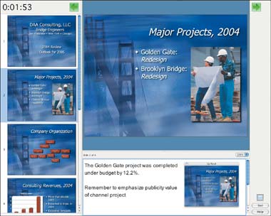 Независимо от того, новичок вы или профессионал, вы наверняка по достоинству оцените превосходную функцию Presenter Tools. Благодаря ей, пока зрители смотрят вашу презентацию с помощью проектора, вы видите на экране монитора компьютера панели изменяемых размеров. Левая отображает нумерованные пиктограммы слайдов презентации. Расположенные наверху часы показывают, сколько у вас осталось выделенного для доклада времени.
