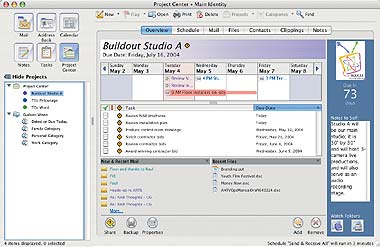 Важнейшее дополнение в Entourage 2004 — утилита Project Center, позволяющая создавать и организовывать проекты, включающие нужную пользователю информацию. В главном окне Project Center имеется семь вкладок: Schedule (содержит планировщик заданий и календарь), Mail (служит для работы с почтой), Files (позволяет осуществлять операции с файлами любого типа), Contacts (открывает Адресную книгу), Clippings (предоставляет доступ к содержимому Scrapbook), Notes (предназначена для ведения записок) и Overview (показывает назначенные на текущую неделю задания и другую информацию). С помощью Project Center легко перейти к любому объекту, связанному с проектом, вне зависимости от того, сохранен ли он в Entourage или же в другом месте на жестком либо сетевом диске.