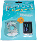 Очередной исследуемый экземпляр скорее является миниатюрным MP3-плеером, чем просто флэш-памятью с функцией плеера. В издании компании Gembird реализована идея, которая несомненно должна понравиться любителям устройств такого класса. Основная «фишка», выгодно отличающая его от остальных, — это встроенный аккумулятор, заряжаемый через порт USB. Больше не надо искать батарейки или таскать с собой аккумуляторы и зарядное устройство. Достаточно посредством USB-кабеля соединиться с ПК — и все, процесс зарядки пошел. Это несомненный плюс, но есть и минус: в дальних путешествиях, если под рукой нет настольного ПК или, на худой конец, ноутбука — вы обречены, тем более что встроенного аккумулятора хватает всего на 5,5 ч непрерывной работы. Прямо скажем, результат плачевный, и по живучести этот образец не конкурент своим собратьям, питающимся от старомодных батарей (такие в среднем живут часов по 10—15). Но производителей можно понять: размеры устройства чуть больше спичечного коробка (58x38x12 мм) и разместить в столь компактном корпусе более емкий аккумулятор крайне затруднительно, а для батарейки даже самого мелкого формата ААА места просто нет. Но утешение это слабое, в дороге хочется послушать музыку подольше.